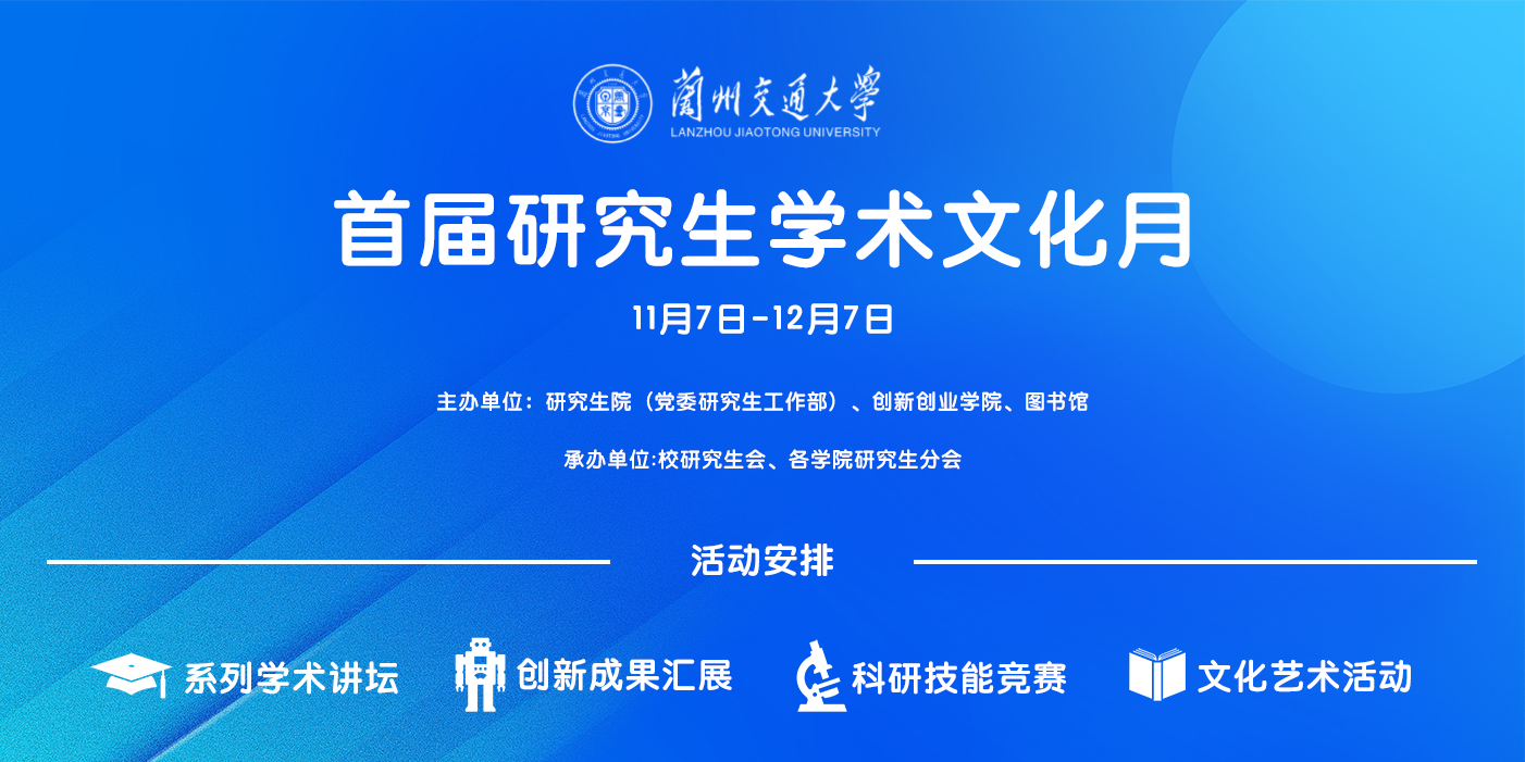 为了进一步营造浓厚的学术氛围,加强研究生创新能力和实践能力的培养,给研究生提供一个学术交流的平台,经研究决定举办兰州交通大学首届“研究生学术文化月”系列活动。