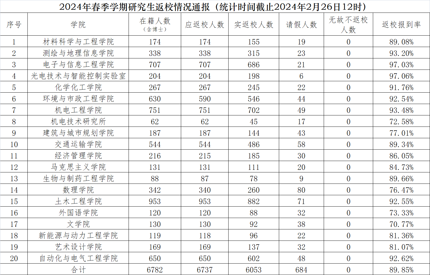 2024年春季学期研究生返校情况通报(统计时间截止2024年2月26日12时)