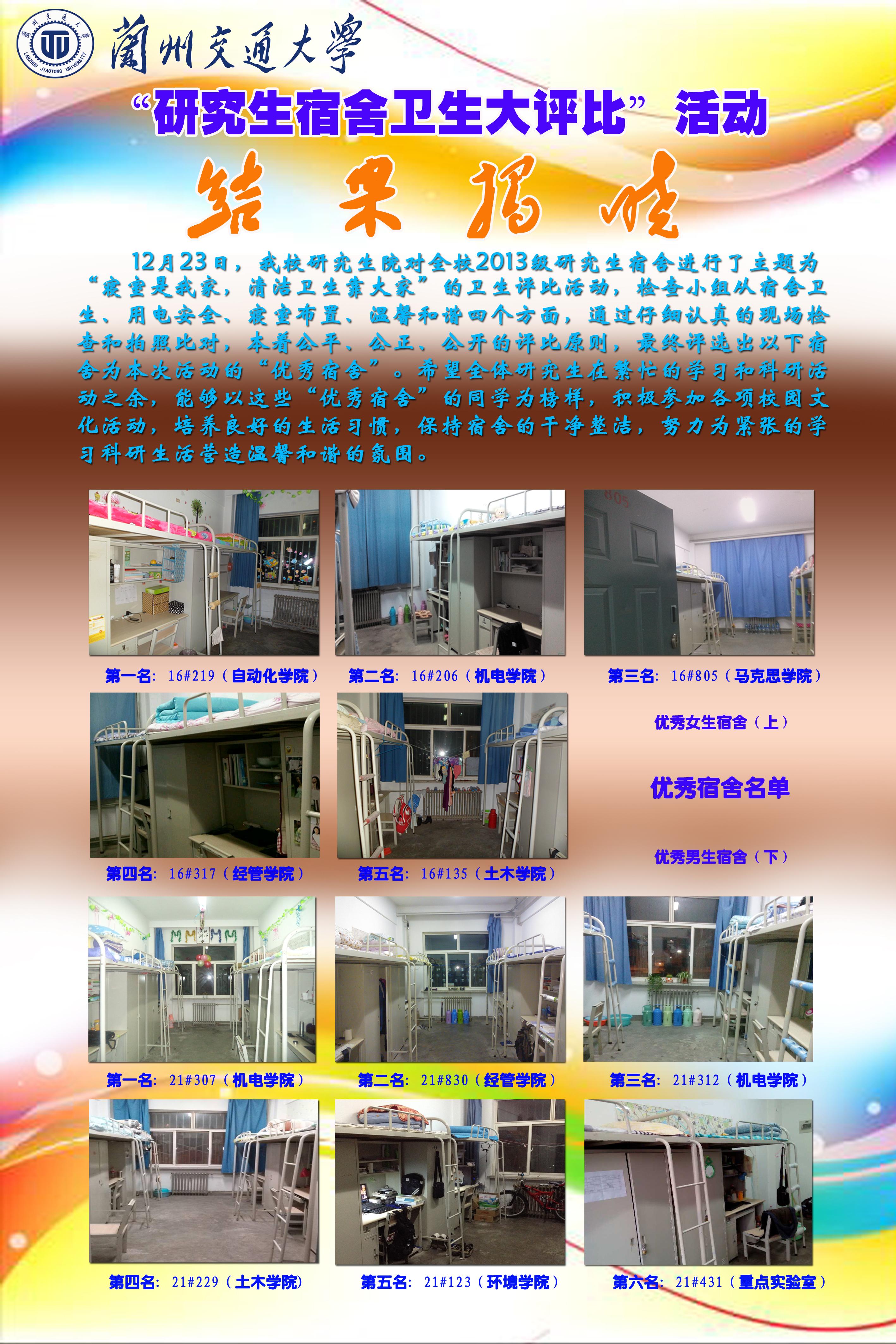 为了增进研究生同学之间的交流与团结,引导研究生树立“室洁书香,有梦有志”的理念,2013 年12月,研究生院开展了以“ 寝室是我家,清洁文明靠大家”为主题的研究生宿舍卫生大评比活动,对全校研究生一年级宿舍从宿舍卫生、用电安全、寝室布置等方面开展了宿舍卫生检查评比,共有6间男生宿舍、5间女生宿舍获奖。本学期开学初,校研究生会在研究生公寓男生21公寓、女生16公寓一楼大厅举行了热烈的颁奖仪式,此次评比活动极大的促进了研究生在日常生活中保持宿舍环境卫生的积极性,活动取得了预期的目的和结果。