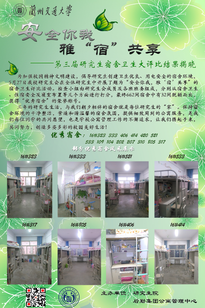 为落实学校“校园安全环境整治月”的阶段工作安排,增强研究生安全防范意识,5月27日,研究生院、后勤集团公寓管理中心联合开展了以“安全你我,雅‘宿’共享”为主题的第三届研究生宿舍卫生评比活动,对全校研究生宿舍进行了检查。