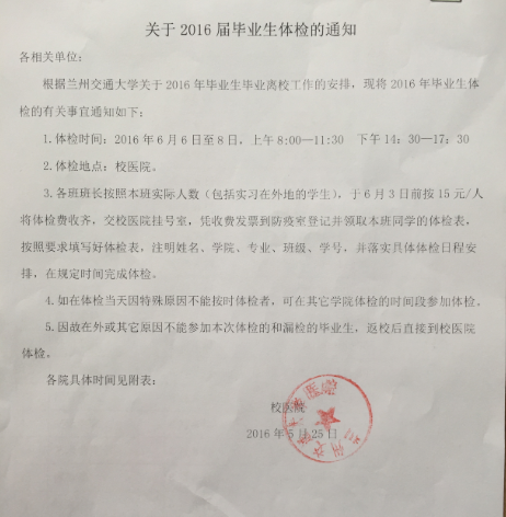 根据兰州交通大学关于2016年毕业生毕业离校工作的安排,现将2016年毕业生体检的有关事宜通知如下,请相关研究生按时参加体检,确有特殊原因不能按时体检者,可在其他学院体检时间段参加体检。